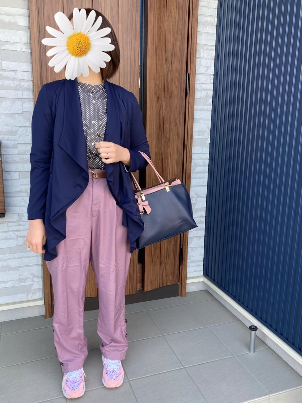 ネイビー×ピンク* ブラウスは前だけタックインして、 ジャケットを脱いだときに後ろは裾のスカラップが見えるように カバンの色味と合わせて、服装も統一 足元はスニーカーで抜け感🎶