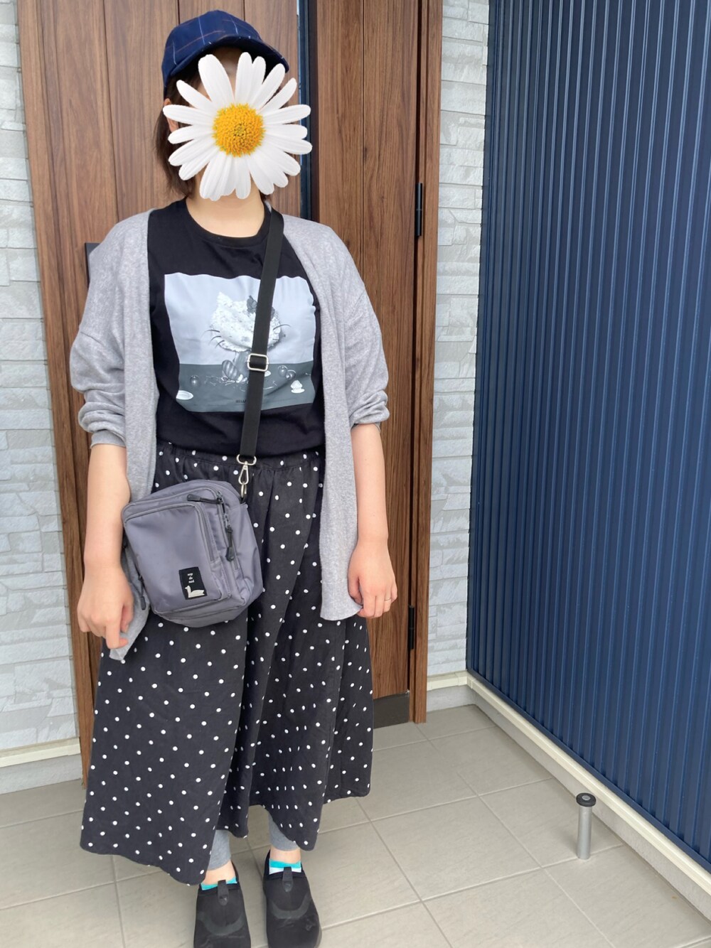 シックな色合いでまとめたお散歩コーデ* キティちゃんに見えるお花のプリントTシャツは可愛くて一目惚れして購入したもの🤭