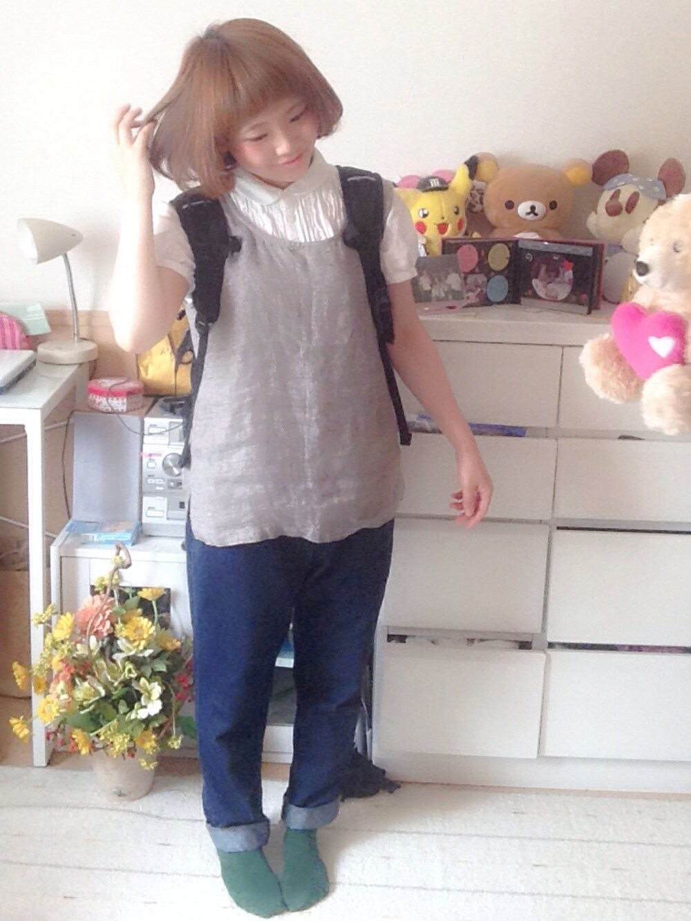 古着屋さんで購入した麻のベスト。 優しい茶色でお気に入りです♩ ゆるーいかんじで、ボーイフレンドデニムをあわせました。 靴下を緑にしてポイントをいれました♩