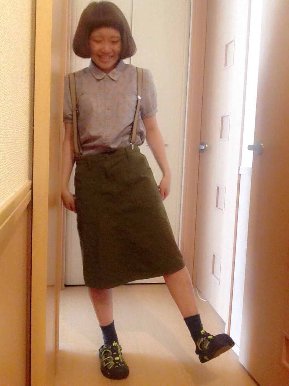 淡いブルーの花柄のシャツにカーキのスカート。\( ˆoˆ )/ シンプルになりすぎないようにーサスペンダーつけました。 足もとはお気に入りのKEENで。 黄色がはえてとってもかわいい〜!!