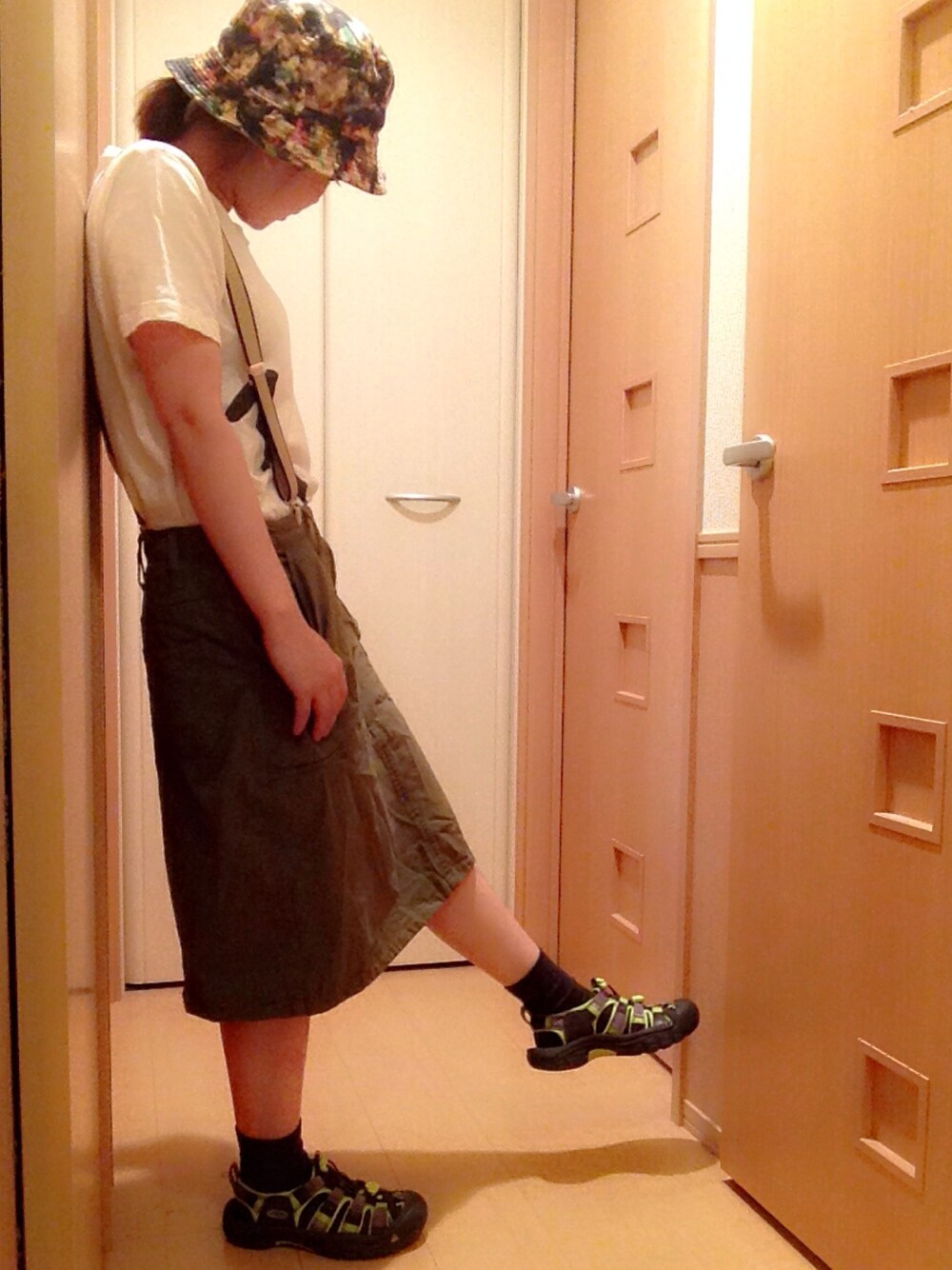 BEAMSのにこちゃんTシャツ。 カーキのスカートはおっきいから、サスペンダーをつけて調節してます♩ お気に入りのKEENで。 バケットハットはもうすっごいお気に入りです♩♩ いろんなバケットハットがほしいなぁ。 今日もとってもいい天気です🌼