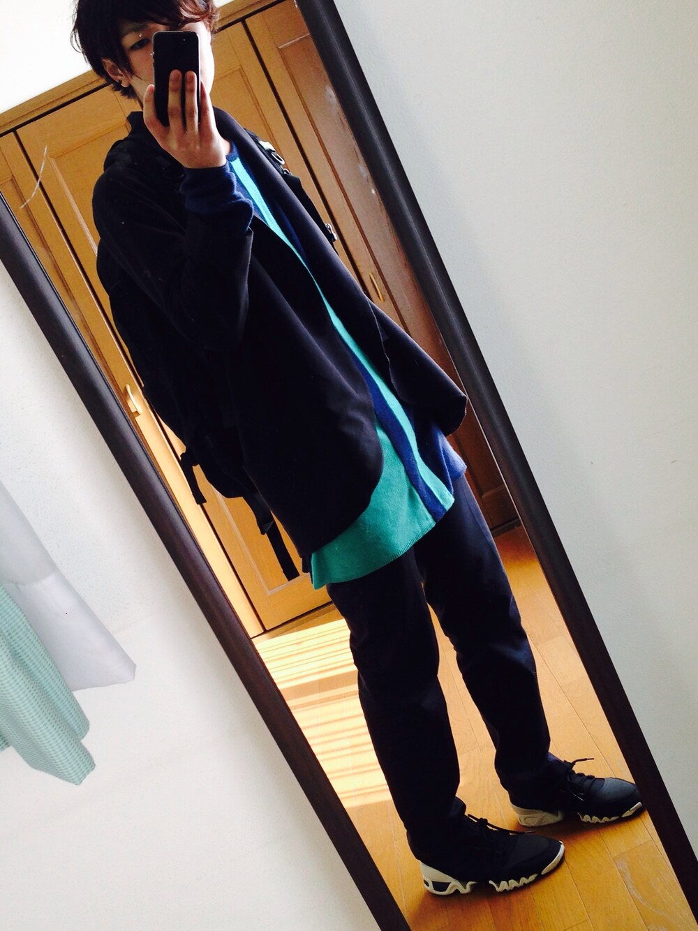 ブラック系のスニーカー、ブルー系のニット/セーターを着用したメンズの冬コーディネートの1枚目の写真