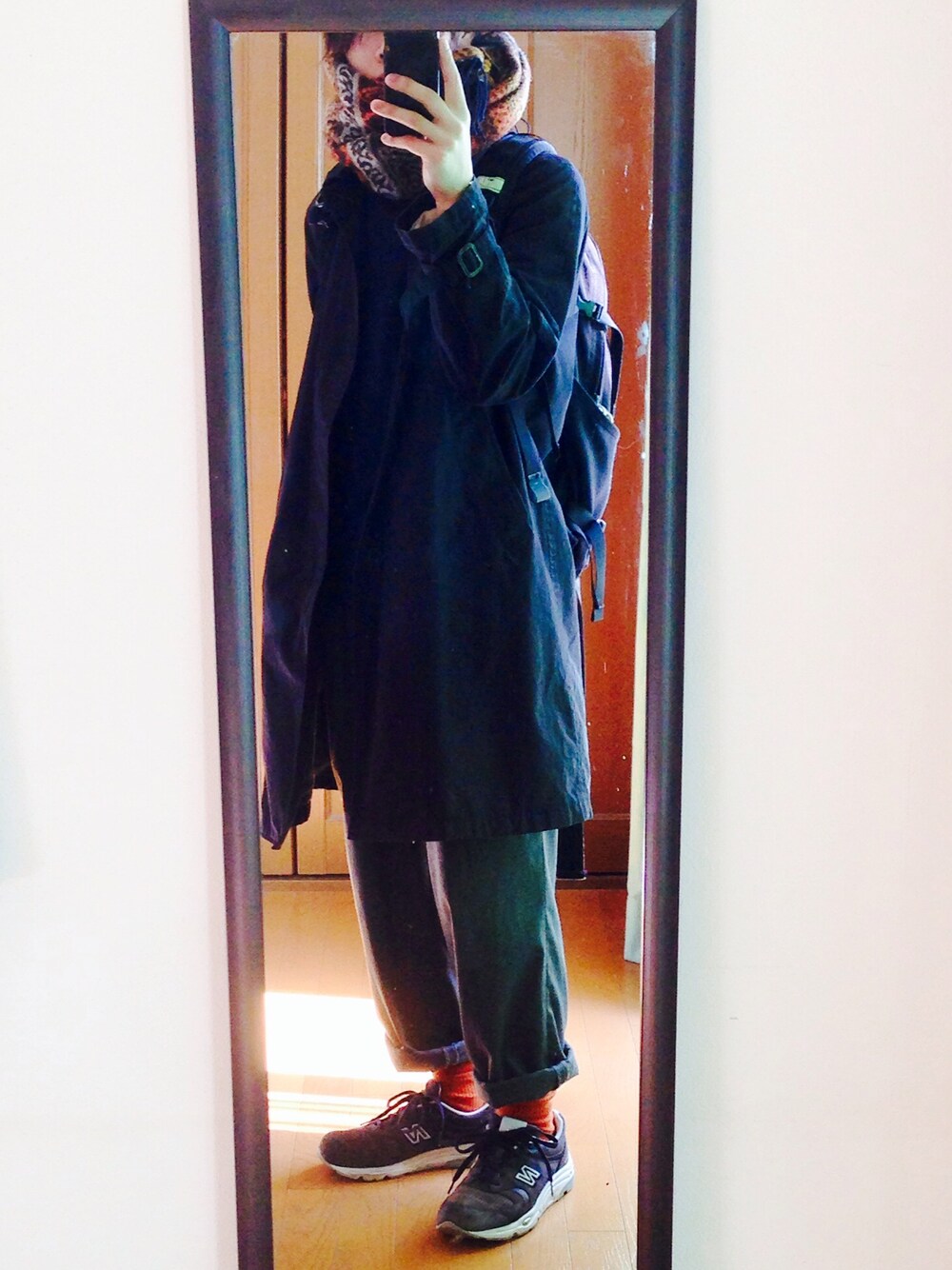 ブラウン系のスニーカーを着用したメンズの冬コーディネートの1枚目の写真