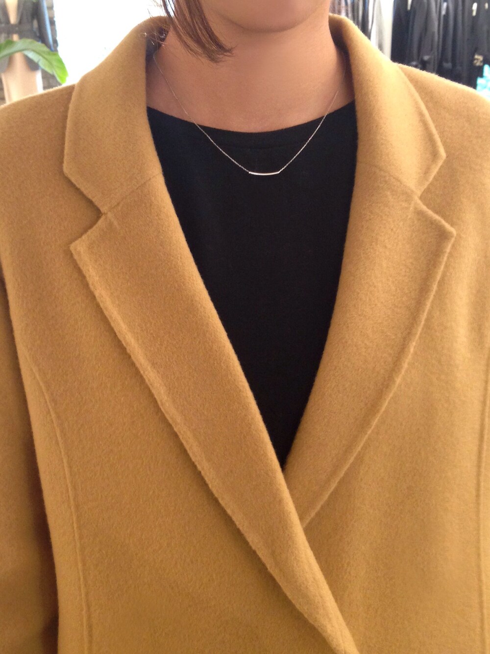 シルバー系のネックレスを着用したレディースの秋コーディネートの1枚目の写真