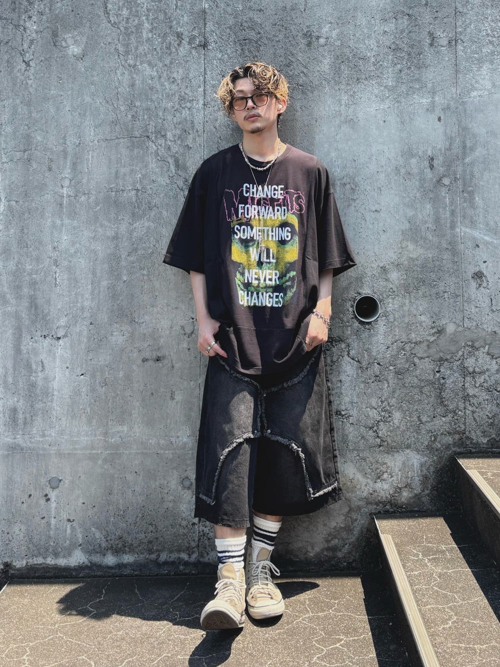 yuのデニムパンツ「a.p.o.v. クラッシュフリンジ変形ダブルニーワイドデニムハーフパンツ」を使ったコーディネート