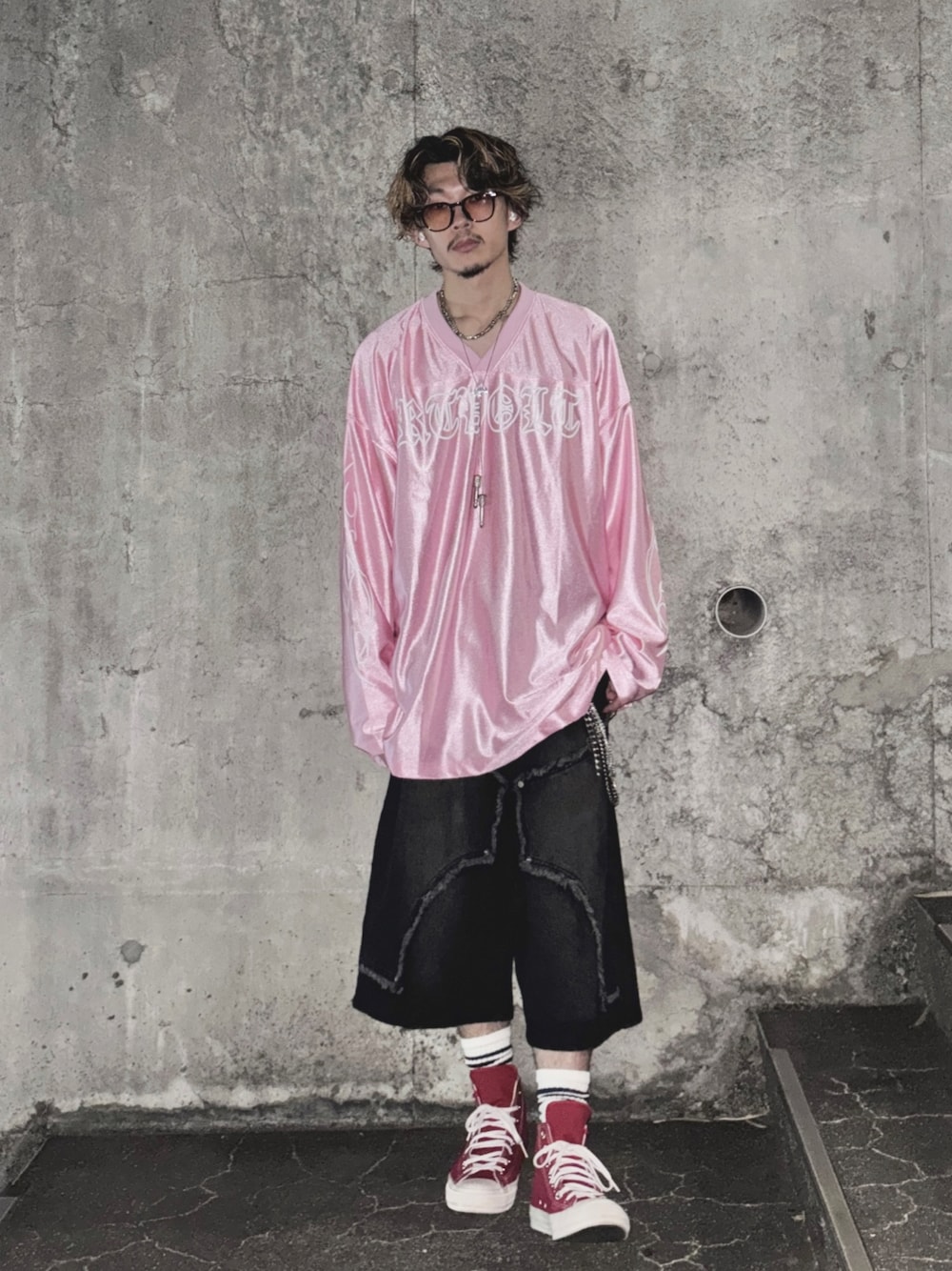 赤コンバース × ピンクゲームシャツ 小物や雰囲気で子供っぽくなりすぎず。
