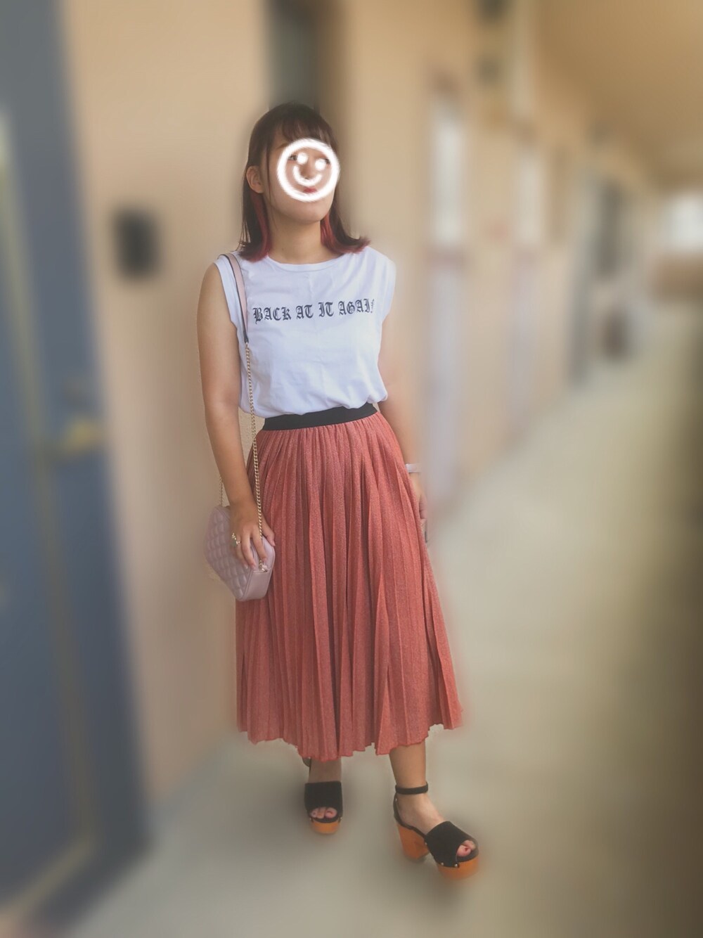 スカートメインコーデ🙆🏼❤️ ロングスカートで露出が少ないからトップスはノースリーブで露出おおめの足し算コーデ🌞 身長が150センチの私はくるぶし上ぐらいの丈でした🌏 ちなみに4900円が1600円ぐらいでした💕