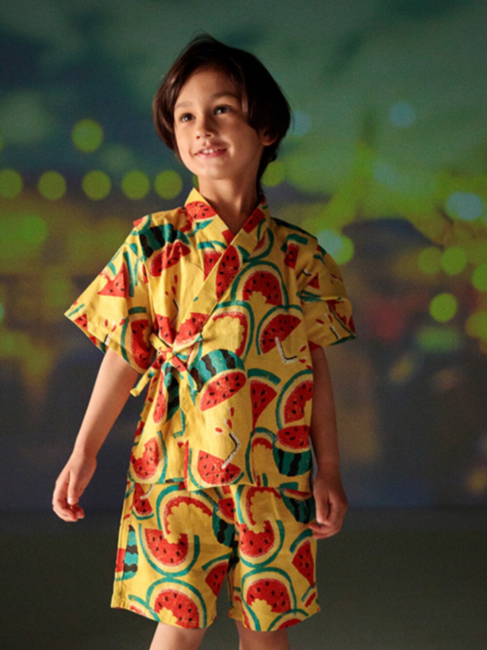 イエロー系の浴衣を着用したキッズの春コーディネートの1枚目の写真