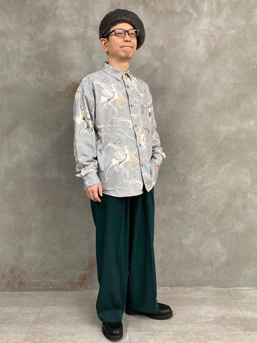 グリーンのパンツを使った大人コーデ グラフィックのシャツはレトロ柄をチョイスしました。 柄シャツはカラーパンツに合わせやすくてオススメです♪