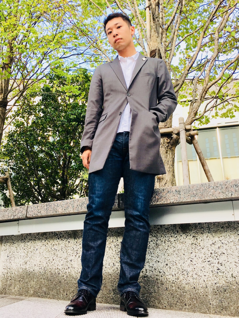 『佳いモノを、シンプルに』 いつもいいね、お気に入り、フォロー頂き本当にありがとうございます! 台風の影響でコーデの外撮りに困りそうなMOONです泣 雨の日が続いたらどこで撮ろうかなホントに( ´Д`) まぁそれはひとまず置いておくとして... 今回のテーマは『遊びの時間は終わりだ...』です笑 白シャツ・グレーチェスターコート・ガラスレザーシューズで構成された完全きれいめコーデです。 コーデのポイントはボトムスにKUROのテーパードジーンズをチョイスすることで意図的にカジュアルダウンさせているところかな。 ここにスラックスとかきれいめアイテム持ってきちゃうと「スーツでいいじゃん」ってなっちゃいそうなので笑。 アイテムの数が四つの場合、きれいめとカジュアルの比率を3:1することでいい感じに纏まるんじゃないかなーって思います。 それではまた次回のコーディネートで(^o^) 以下アイテム紹介 【アウター】 COMME CA COMMUNEのグレーチェスターコート。細身かつシンプルなデザインがきれいめでカッコいい。グレーのチェスターコートって意外と着てる人少ないのでオススメ。 【インナー】 ゲートタワーのBEAUTY&YOUTHにて購入したFolkの白シャツ。ミニマムなデザインがシンプルにカッコいい。白シャツは着回しが効くため拘ったアイテムを使いたい派。 【ボトムス】 栄にあるKURO NAGOYAにて購入した「DIAMANTE」のシリーズ。キュッと効いたテーパードとヴィンテージ加工がめっちゃカッコいい。僕が所持しているジーンズの中で一番お気に入りの一本。 【シューズ】 タケオキクチのプレーントゥ。名鉄のメンズ館にて購入。シンプルなデザインとガラスレザーを使用したワインレッドに心を撃ち抜かれた一足。めっちゃカッコいい。 よろしければいいね、お気に入り、フォローお願いします!