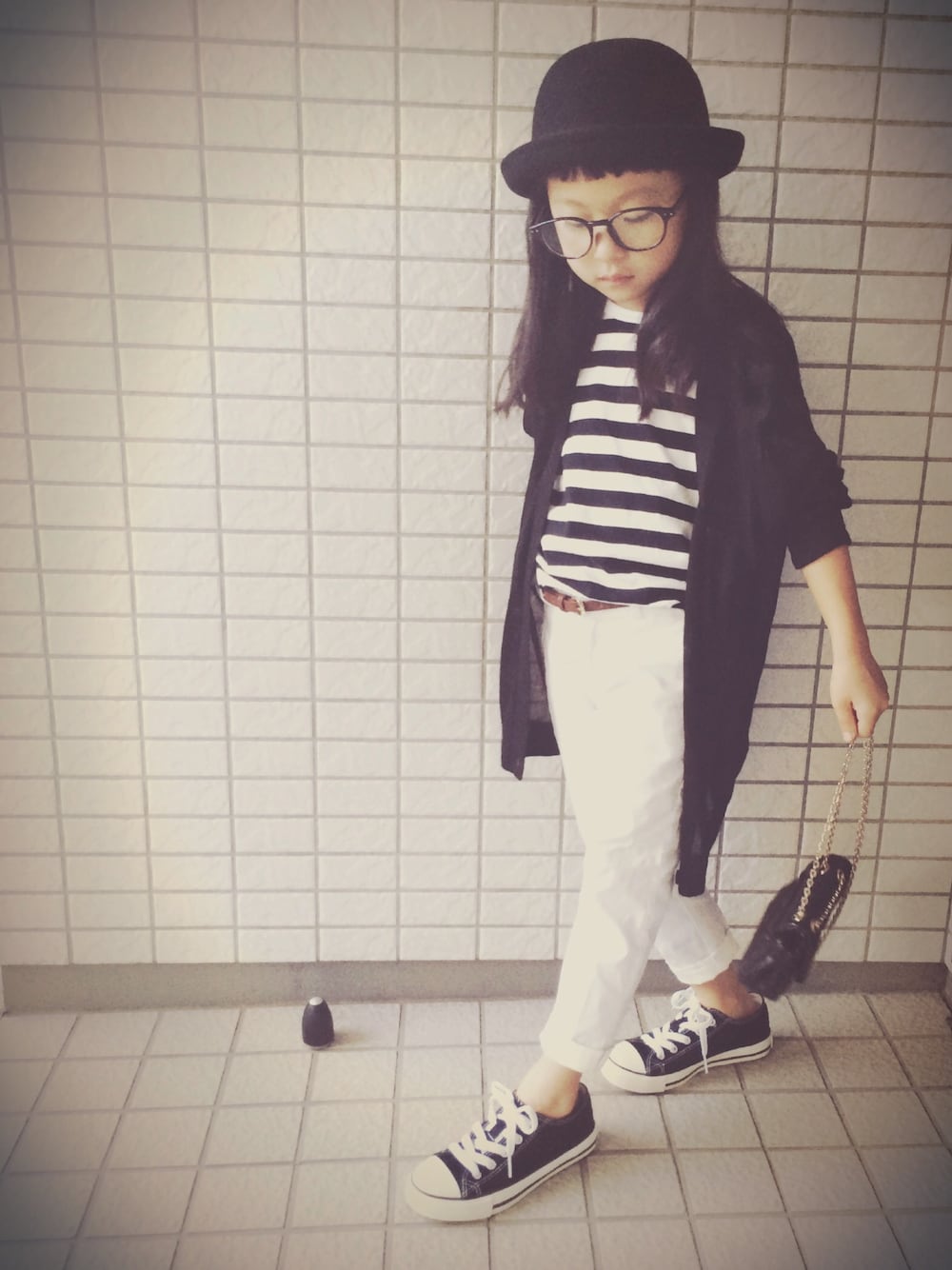 ホワイト系のTシャツ/カットソー、ブラック系のハットを着用したキッズの秋コーディネートの1枚目の写真