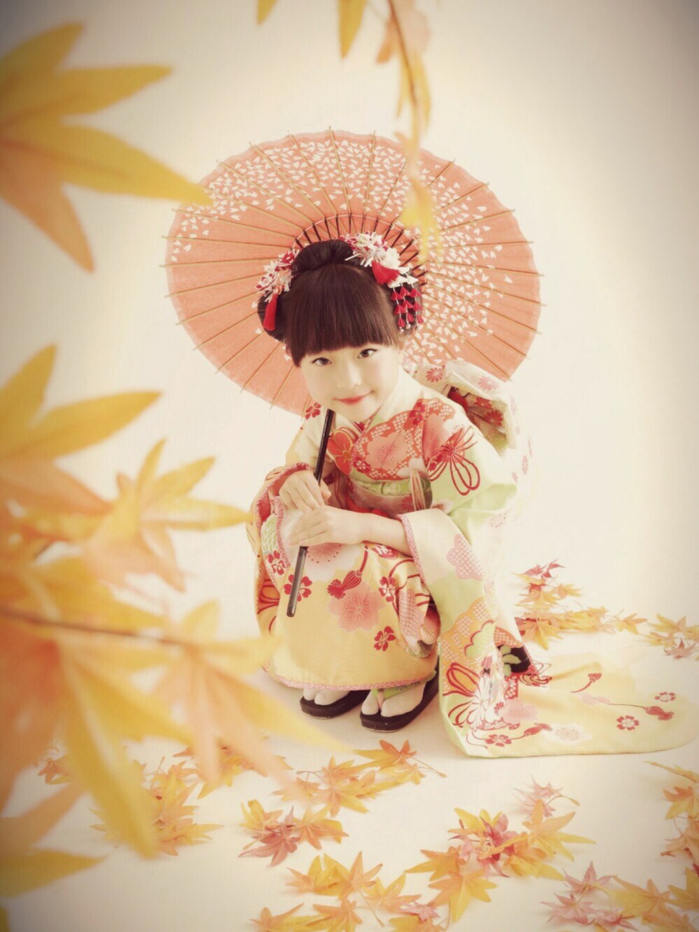ブラック系の浴衣を着用したキッズの秋コーディネートの1枚目の写真