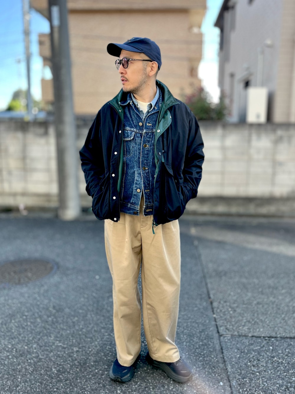 エルエルビーンのナイロンジャケットとリーのジージャンで王道アメカジを押さえつつ、GUのプチプラパンツで気軽さをプラス。動きやすくて機能的だから、子どもと公園に行く日や家族でのお出かけにもピッタリ。シンプルだけどレイヤードで魅せる、頼れるパパのためのコーデです!