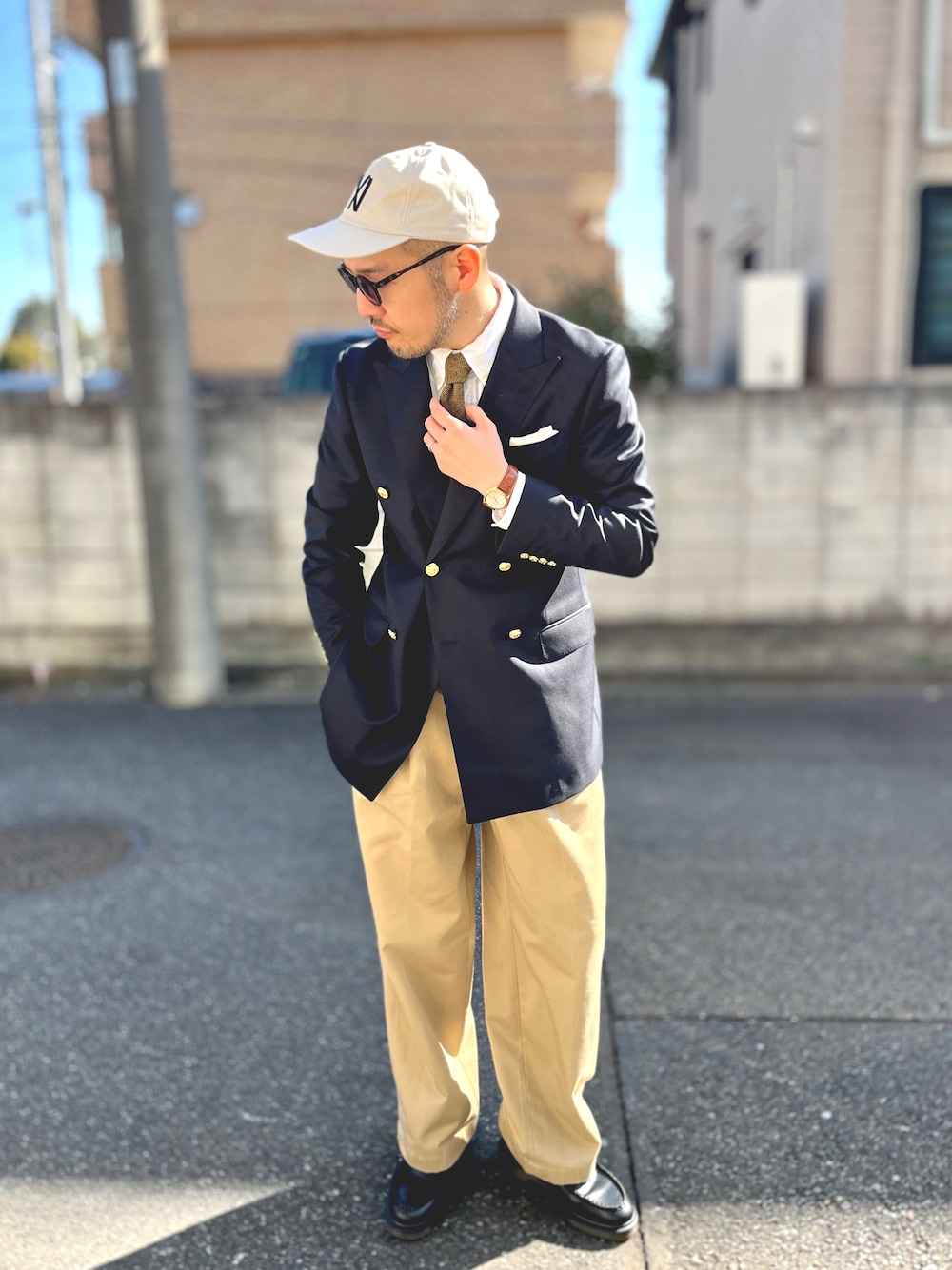 ダブルのネイビーブレザーを主役にした、クラシックなアイビールックを現代的にアレンジしたスタイル。ゴールドのメタルボタンが映えるブレザーは、ホワイトのチーフやレジメンタルタイと合わせることで、上品かつトラッドな印象を強調。 しかし、そこにカジュアルなエッセンスをプラスするのがこのコーデの魅力。キャップとサングラスで程よい抜け感を作り、足元はボリューム感のあるレザーシューズでバランスを取っている。パンツはチノ素材のワイドフィットを選び、ストリート感をさりげなくプラス。アイビーとアメリカンカジュアルの融合が、洗練された都会的な雰囲気を演出している。 フォーマルとカジュアルの絶妙なバランスを楽しむ、大人のアメカジスタイル。