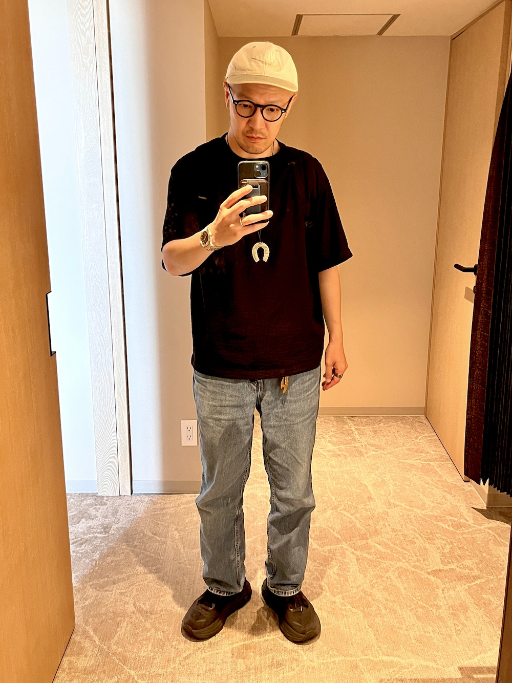 NIKEの古着キャップに、Adawat’n Tuaregのシルバーネックレスをアクセントにしたシンプルコーデ。 ブラックTと淡いブルーデニムの王道コンビに、足元はボリュームのあるブラックスニーカーでバランスを調整。 小物に宿る“文化とクラフト”が、無地Tスタイルを一段格上げしてくれる。
