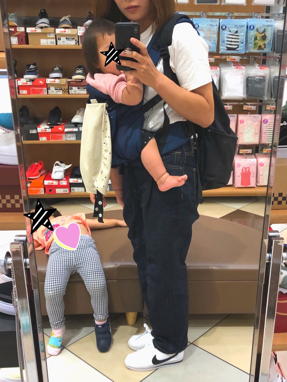 ショッピングモールの催事場にて。 娘とリンクしようと悩んでたら、試着用の椅子で腹出して寝てた…😵