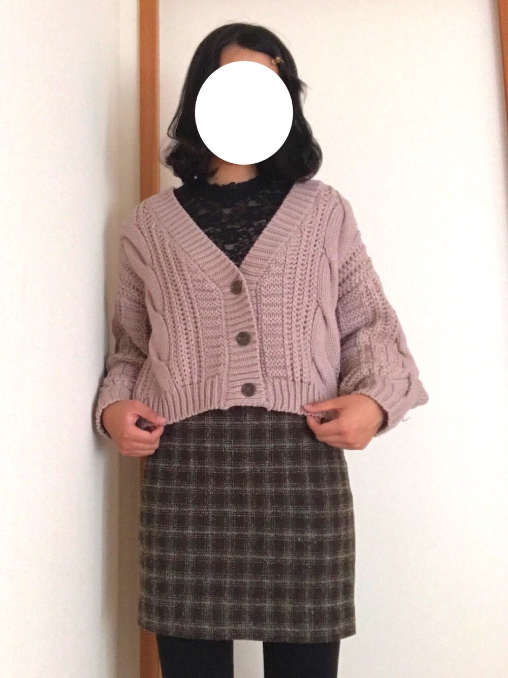 ピンクとブラウンの組み合わせはアポロみたいでかわいいと思ってます カーディガンの下にレースを着るのはお気に入りで、今回は黒タイツを履いたので、レースも黒にしました