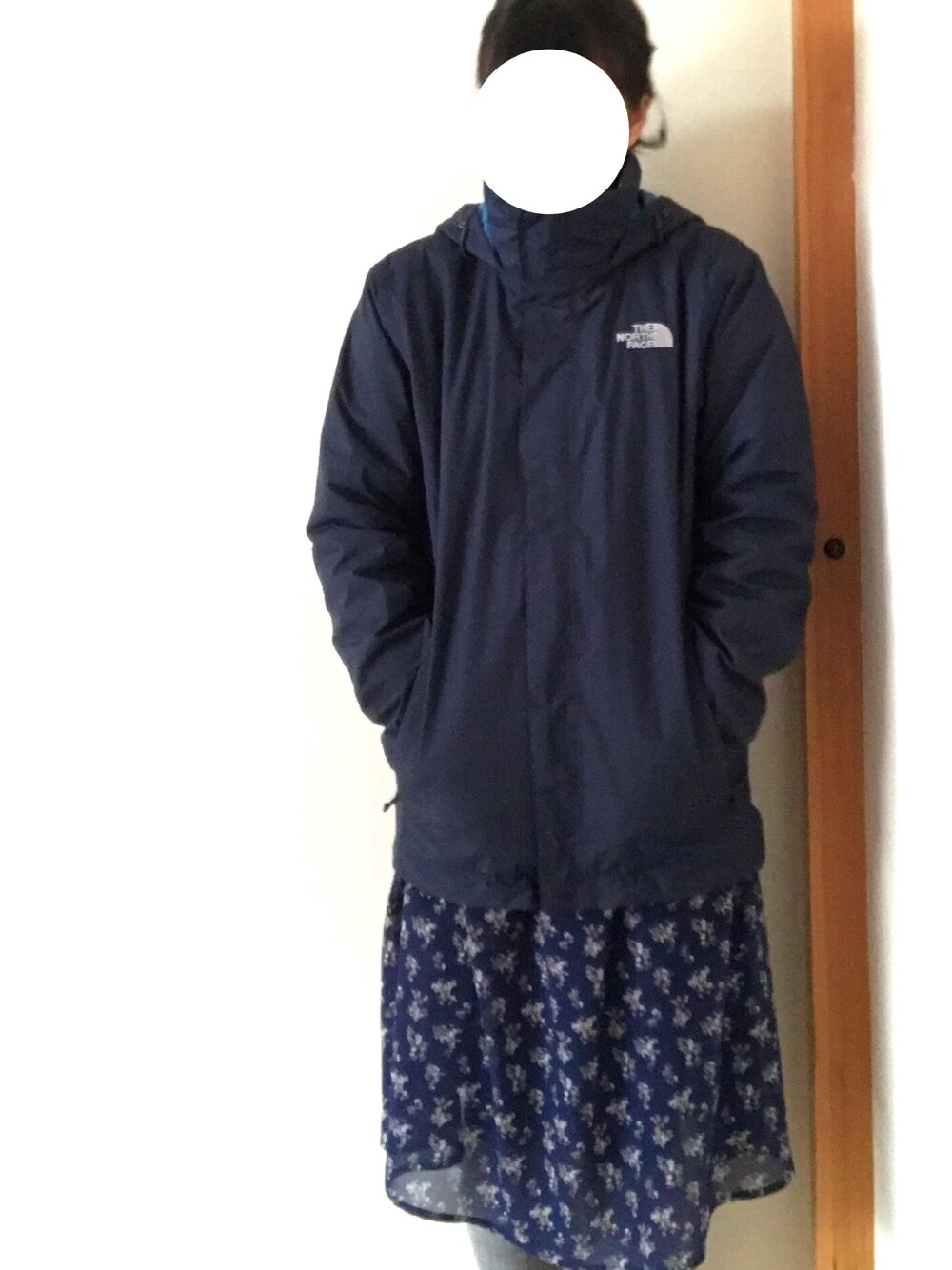 ノースフェイスの上着を買いました! メンズのMなので結構大きめですが暖かくていい感じです 花柄のワンピースでかわいさも ユニクロのヒートテックのタイツは暖かくて、足先もそこまで冷えません 薄着そうに見えてすごく暖かいです