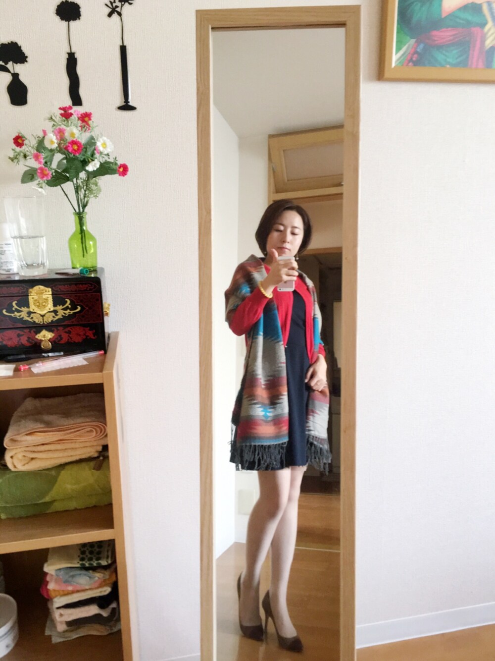 先週はまだ30度で夏温度だけど、今週は一気に寒くなったよね。 やっぱ赤が好きで、今日のカーディガンも赤です! こういう時期はマフラーが一番使いやすいね〜色が鮮やかなものが好きだから、派手なマフラーが選んだ。 シューズは大好きなドレスハイヒール、色も秋っぽくて、ヒールの高さも適性、疲れにくくていいものだよ。 さあ〜寒い一日も仕事頑張りましょう〜
