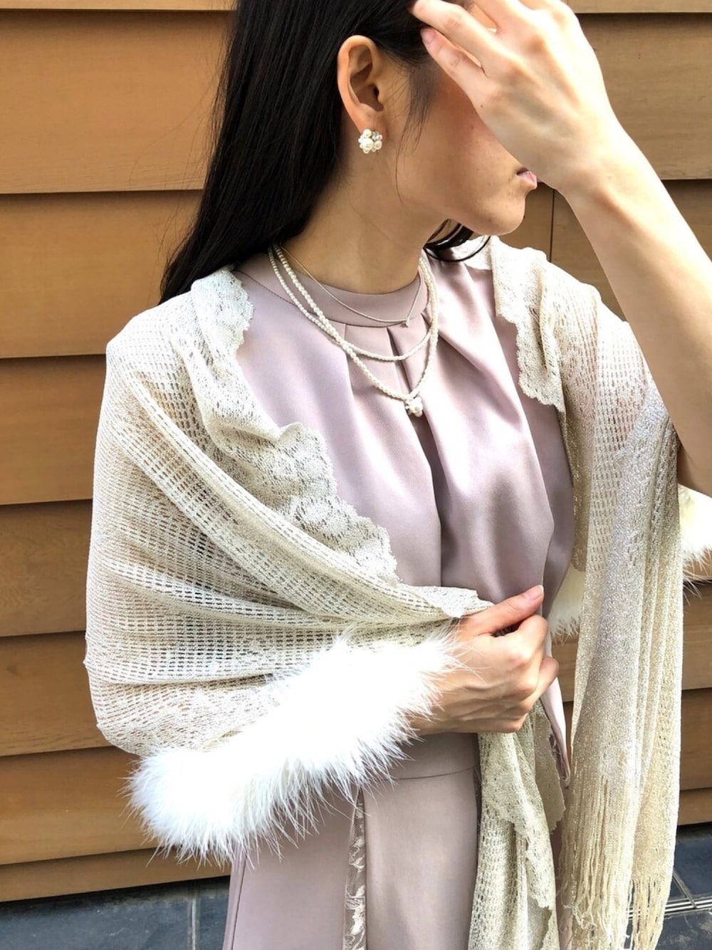 formformaSTAFFのストール/ショール「マラボー付き フォーマルラメショール」を使ったコーディネート