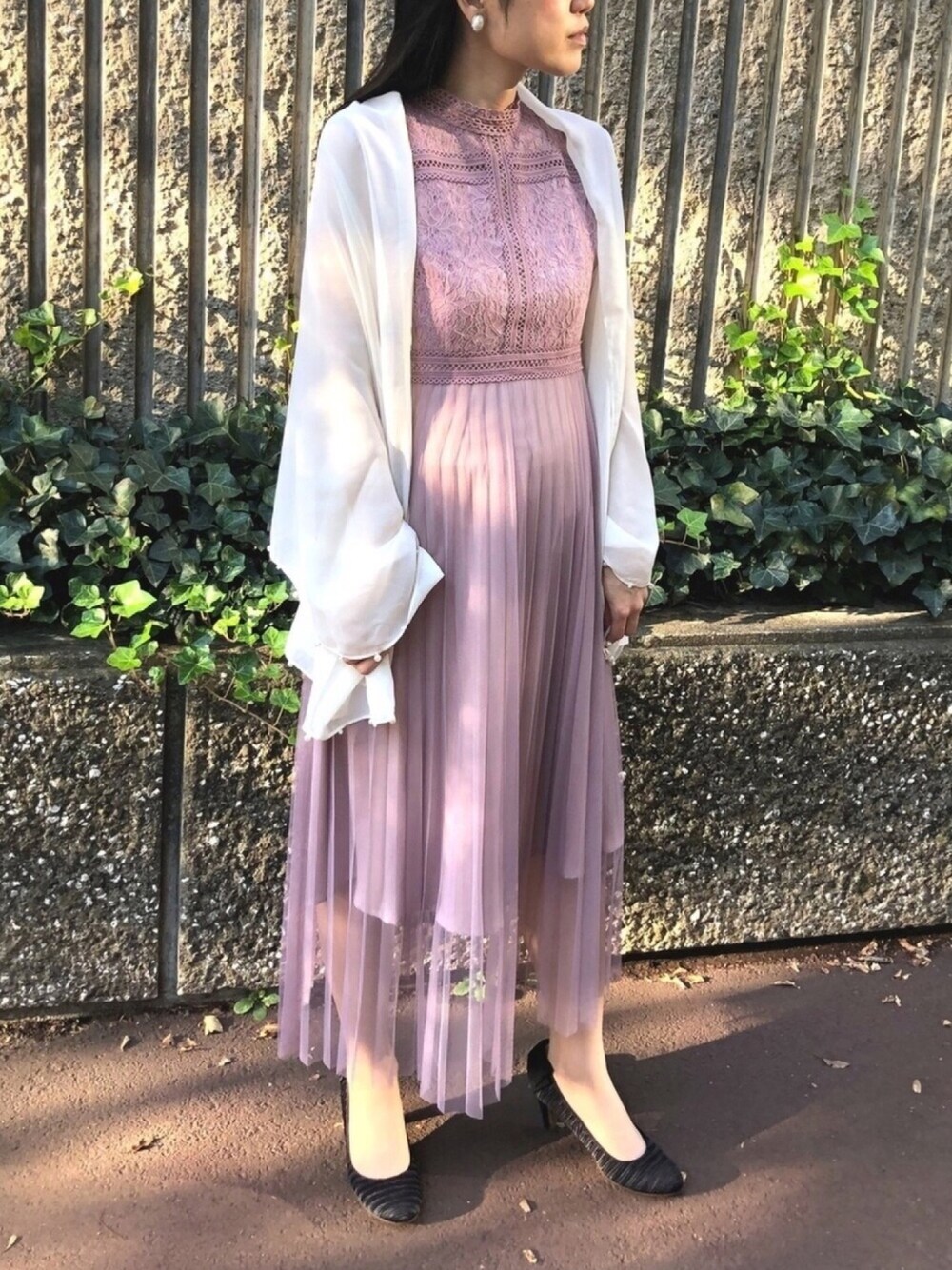くすみピンクにオフホワイトを合わせて❤︎ ショールはシフォンのオフホワイトを合わせて、少し甘めに❤︎ トレンドのくすみピンクを定番のオフホワイトで合わせると安定の素敵なスタイルに❤︎