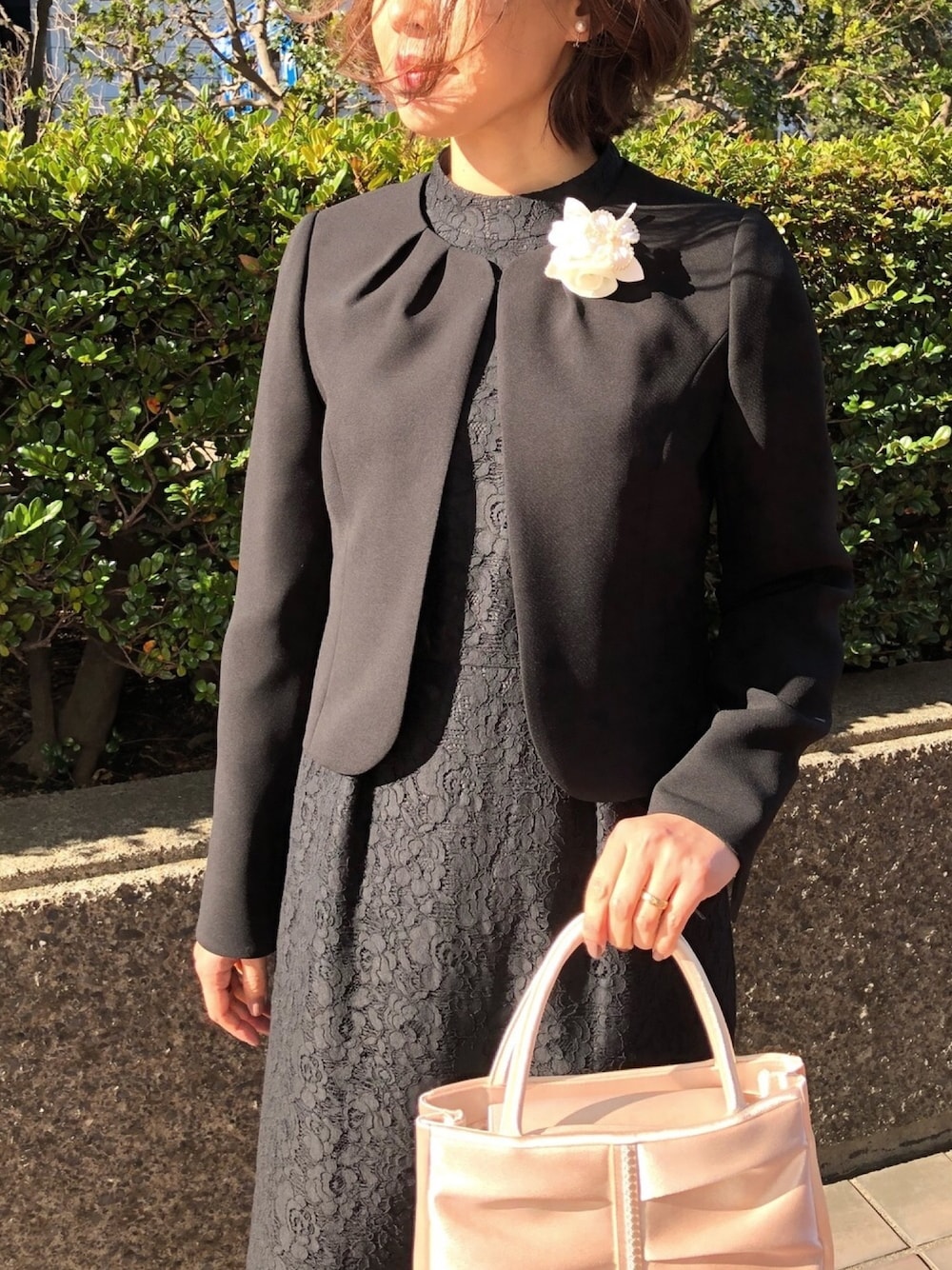 formformaSTAFFのスーツセット「ノーカラージャケット&総レースボトルネックロングワンピース ブラックフォーマルスーツ」を使ったコーディネート