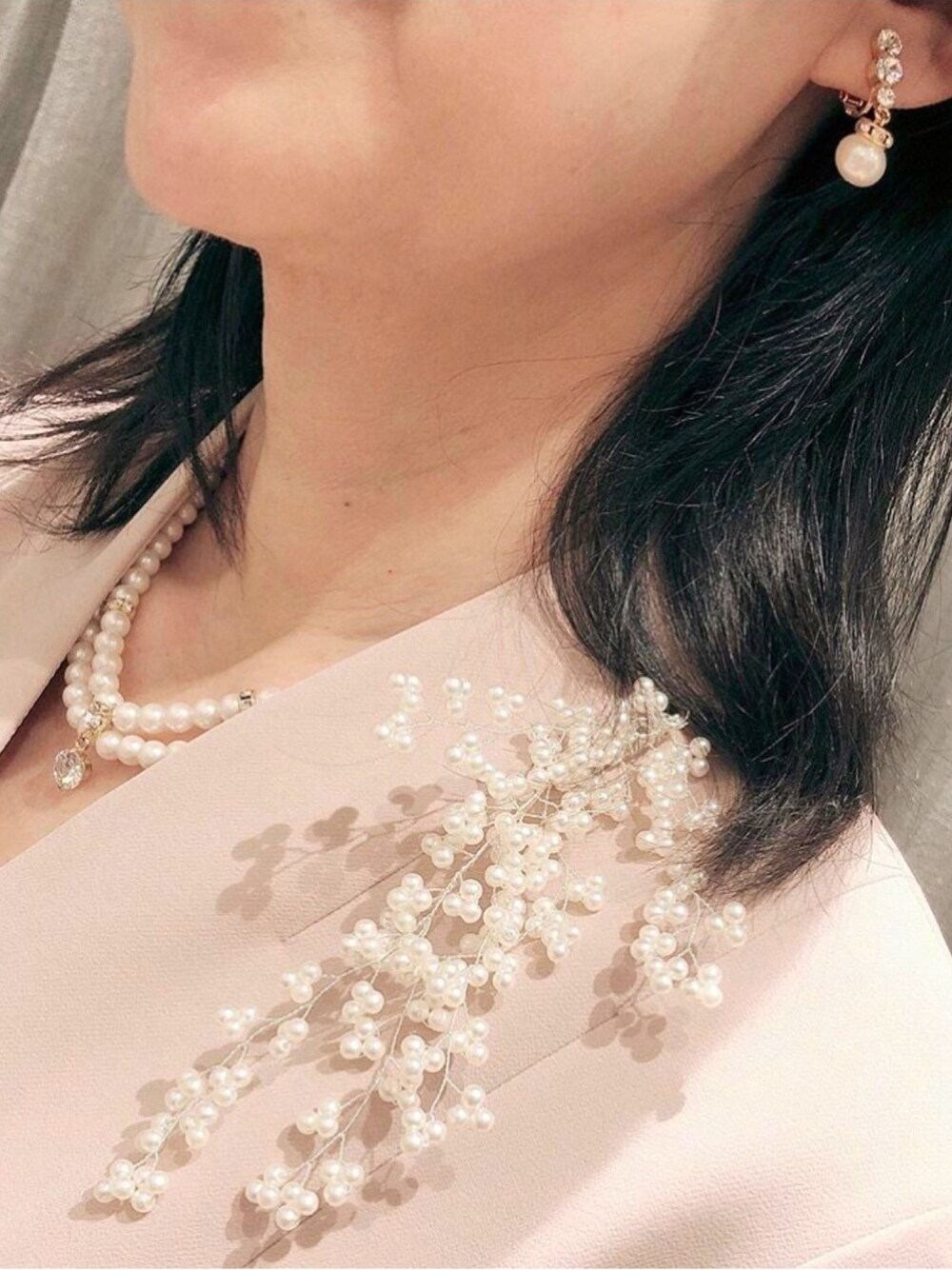 パール素材のアクセサリーは グッとフォーマルの装いに。