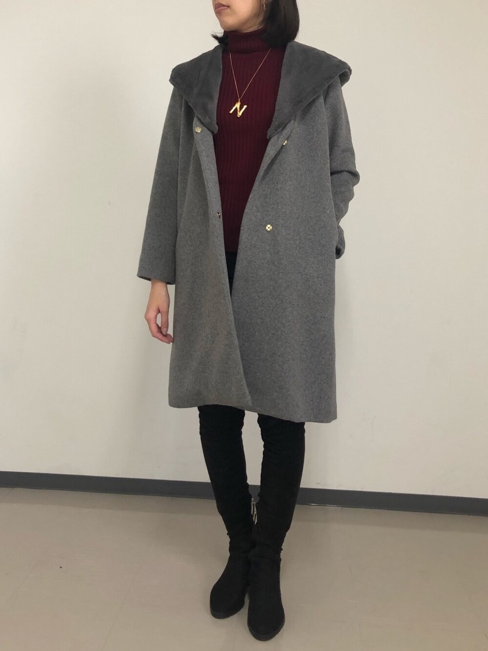 formformaSTAFFのノーカラーコート「ファー付きノーカラーVネックウールコート」を使ったコーディネート