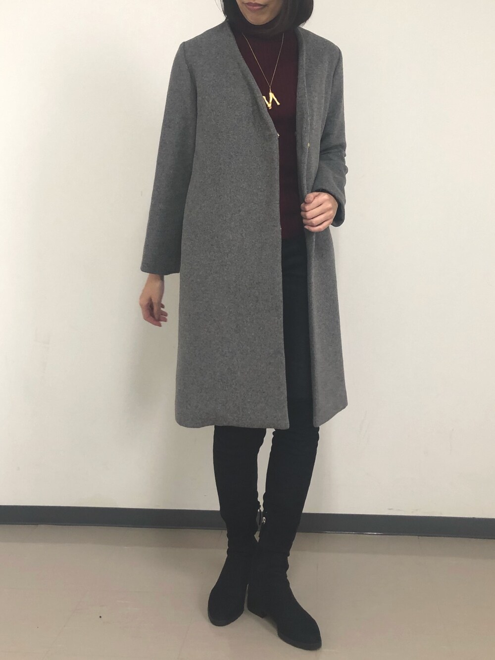 formformaSTAFFのノーカラーコート「ファー付きノーカラーVネックウールコート」を使ったコーディネート