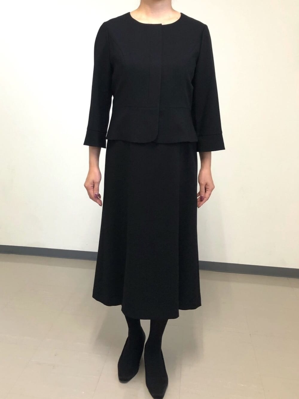 【セットアップワンピースver】 スタッフM ※身長159㎝『今回の着用サイズ:9号』 ※普段の着用サイズ:S/M(9号) ※試着の際に気になる事…腕が長めなので9号で袖丈が短い時がある ■丈感…膝はしっかり隠れる。丈感はふくらはぎくらい。 ■首周り…ゆとりあり。 ■胸周り…ゆとりあり。 ■袖長さ…手の甲くらいでちょうど良い ■二の腕周り…ゆとりあり。 ■どのサイズを選ぶか…9号 ■コメント スタンドタイプのジャケットでスカート丈もしっかりある。素材の良さを感じられる上質なブラックフォーマルの印象で喪主としての立場(正喪服)として安心して着用出来るスーツだと感じた。