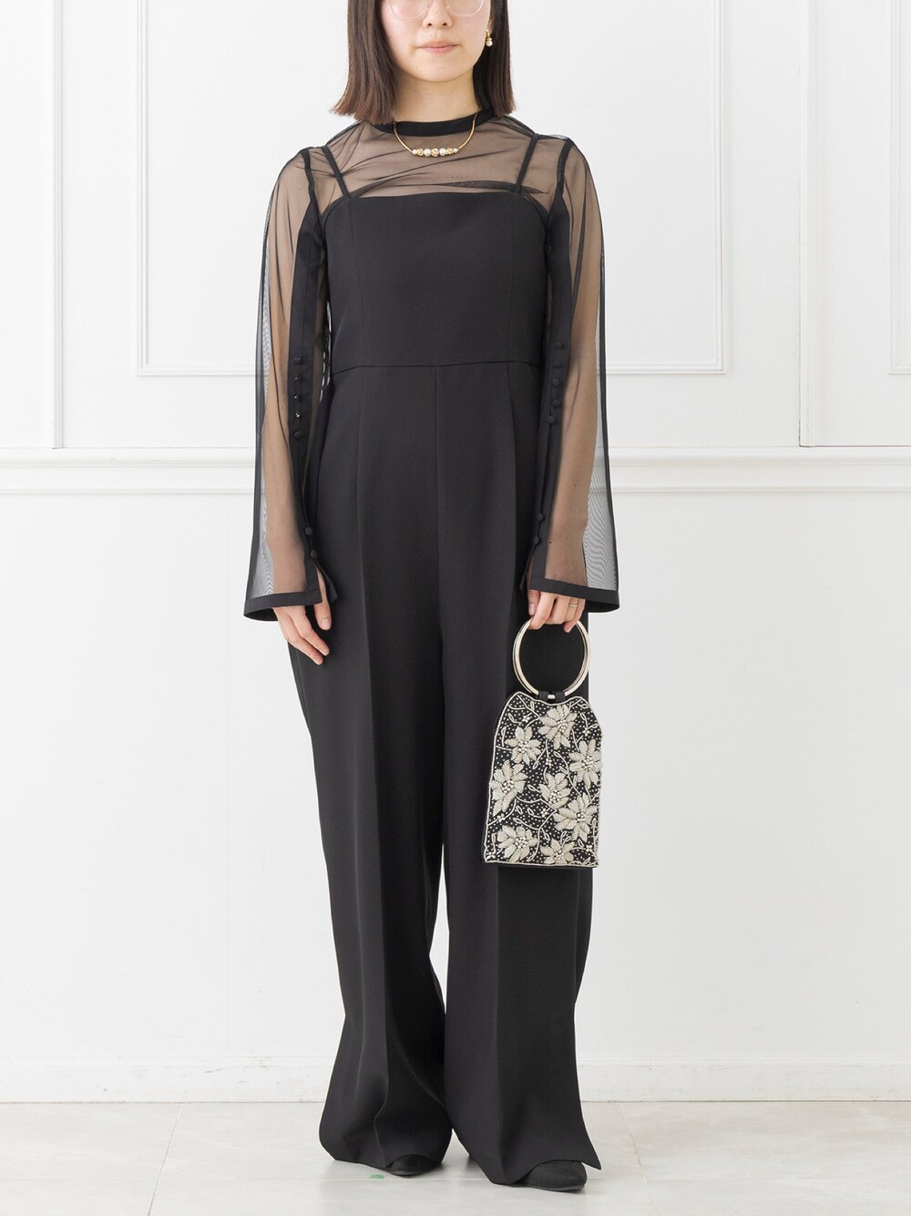 インナーの シアー素材チュールトップスが可愛い! トレンド感たっぷりのアイテム。 身長155cmだと高めのヒールで着用がオススメ!