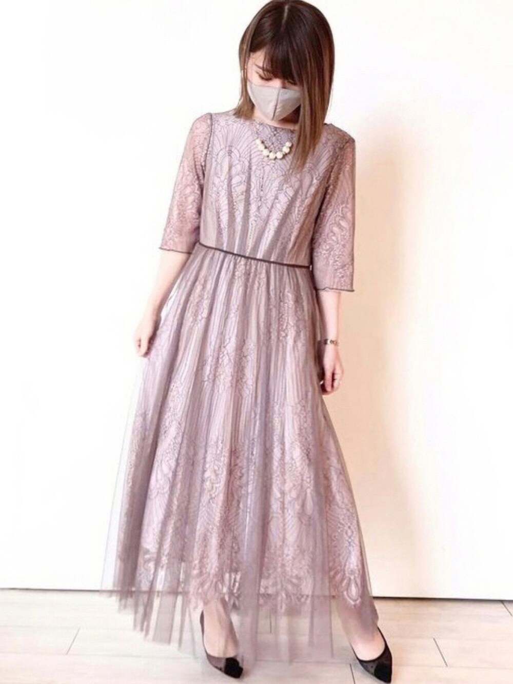 くすみカラーで大人っぽく✨ チュールを重ねてレースを際立たせたロマンチックワンピース♡