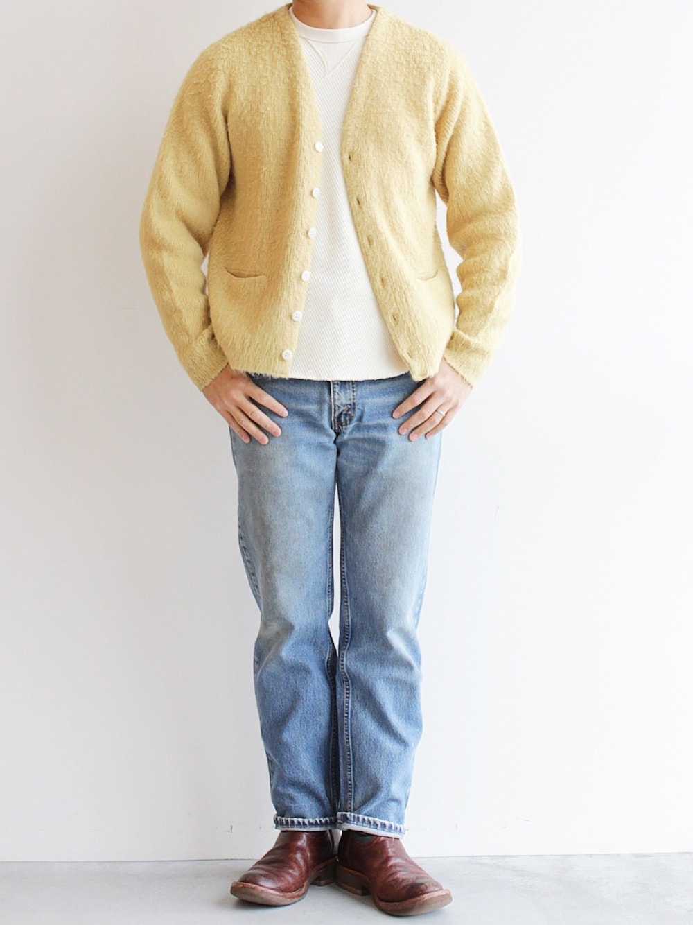 お気に入りの ヴィンテージモヘアカーディガンに シンプルにユーズドデニムを合わせました。 シルプルながら好きなアイテムで コーディネートしたお気に入りスタイルです。 Instagram@fortgeneralstore HP www.fort-gs.com