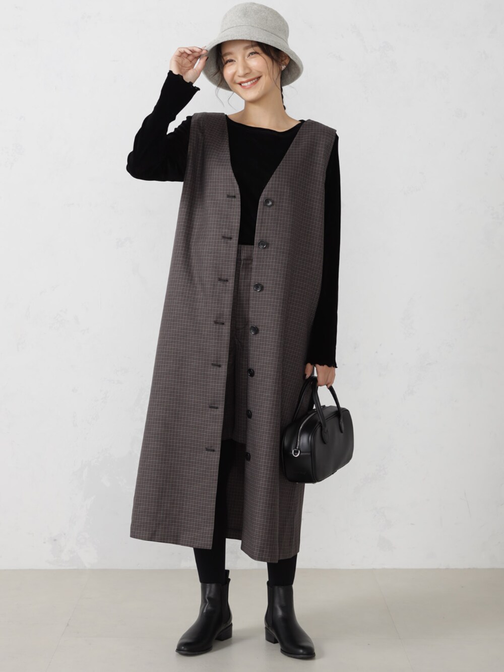 ジャンパースカートとしてフェミニンに、またジレとしてハンサムにと多彩なスタイリングを楽しめます。