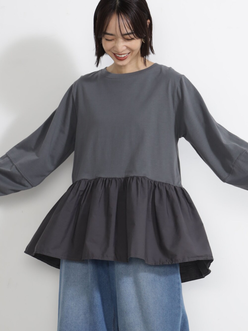 人気のティアードデザイン。 ティアード部分を別布使いすることで、さりげないメリハリ感をプラス。 ふわりとボリュームをもたせた袖も、即座におしゃれが完成するポイントです。