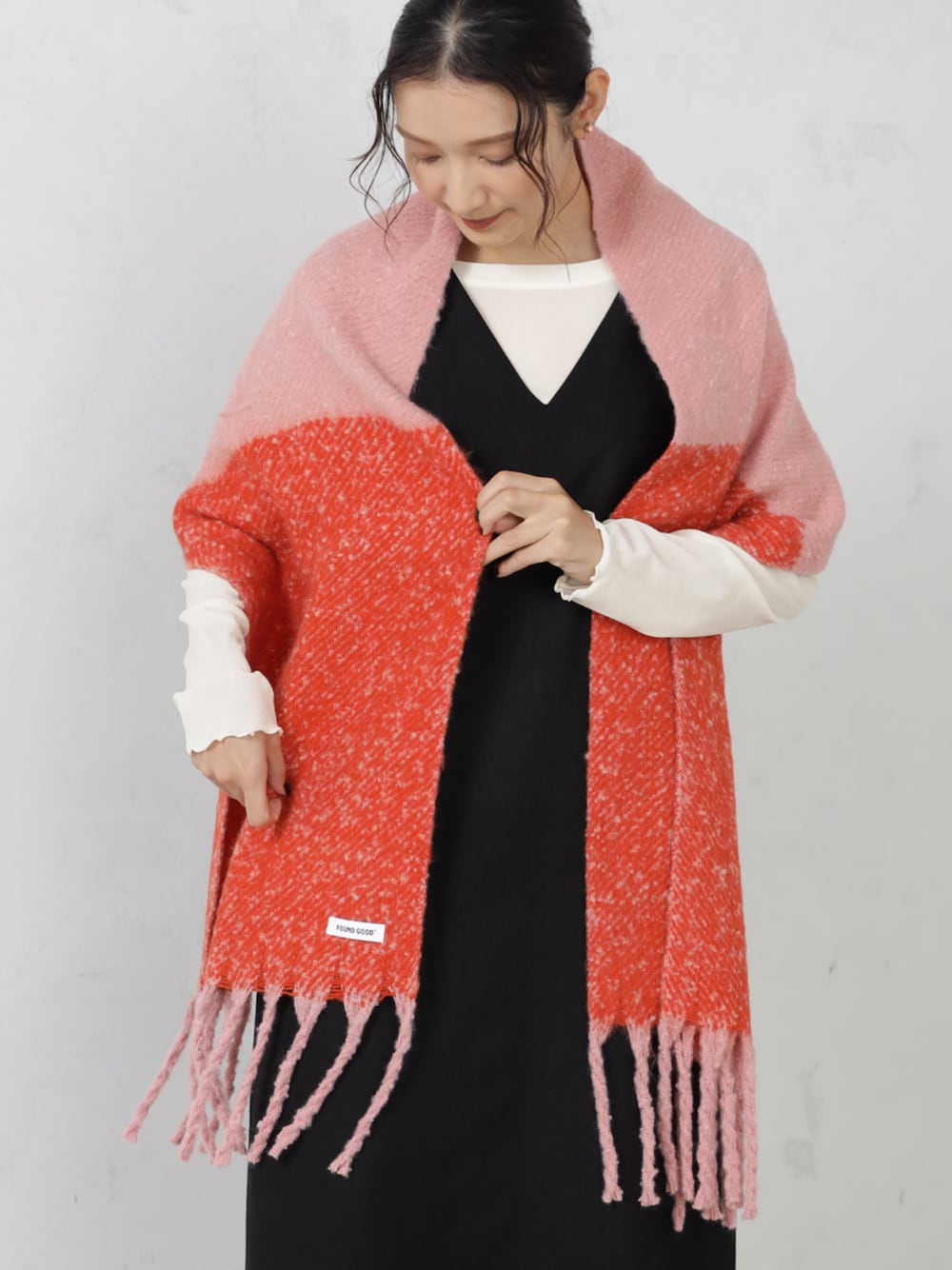 トレンド感のあるカラーブロック仕様のマフラー。 ほどよいボリュームと太フリンジも華やかな印象。 物足りなさを感じるシンプルコーデのブラッシュアップに最適なアイテムです。