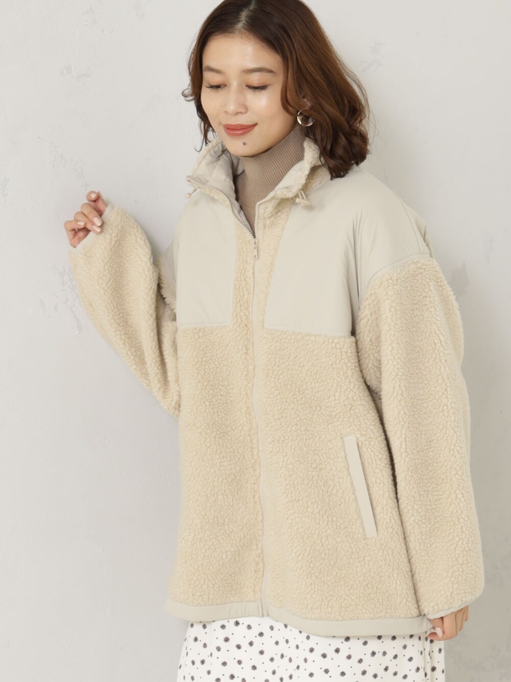 アウトドアテイストが可愛いボアブルゾン。ボアとポリエステル生地を切り替え、素材にコントラスト感を加えたアイテム。