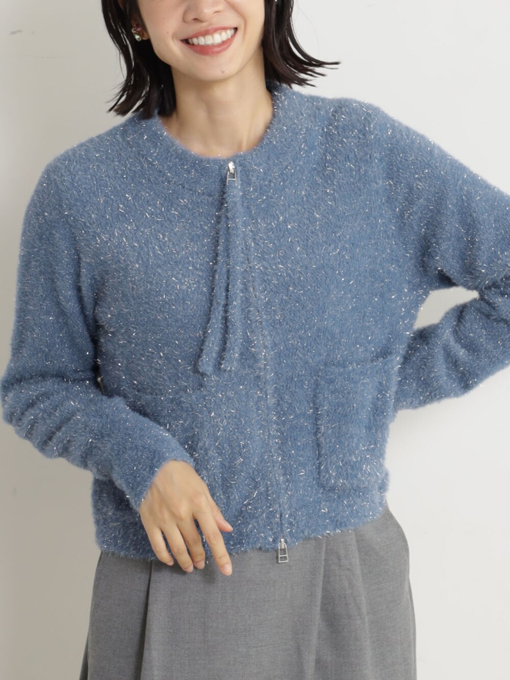 FOUND GOOD(FOUND GOOD)のカーディガン/ボレロ「ラメシャギーニットZIPCD」を使ったコーディネート