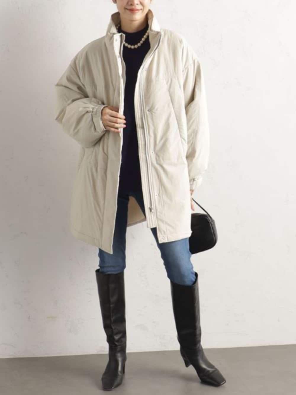 微光沢のあるなめらかな風合いがエレガントな中綿コート。 オーバーシルエットになっており、厚手のインナーを着ていてもすっきりきまります。 軽い着心地で暖かいため、デイリーはもちろんアクティブに動きたい日にもおすすめ。 ジップを上まで閉じればスタンドネックになり、首元もしっかり保温できます 。