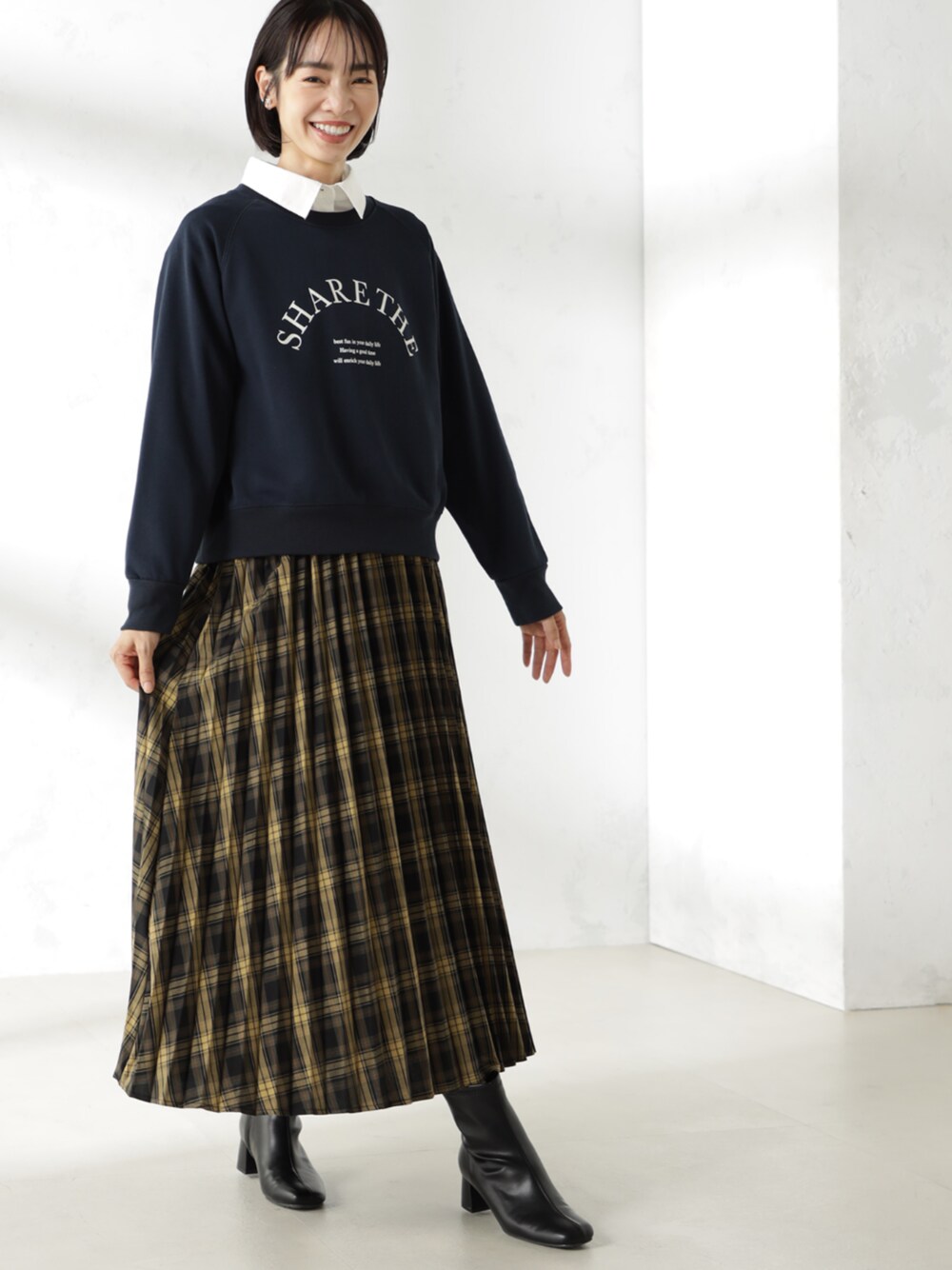 シャツやハイネックトップスなど、レイヤードして首元から見せるのもおすすめ。 プリーツスカートやフェミニンなボトムをあわせて甘さをプラスするとトレンド感のある着こなしを楽しめます。
