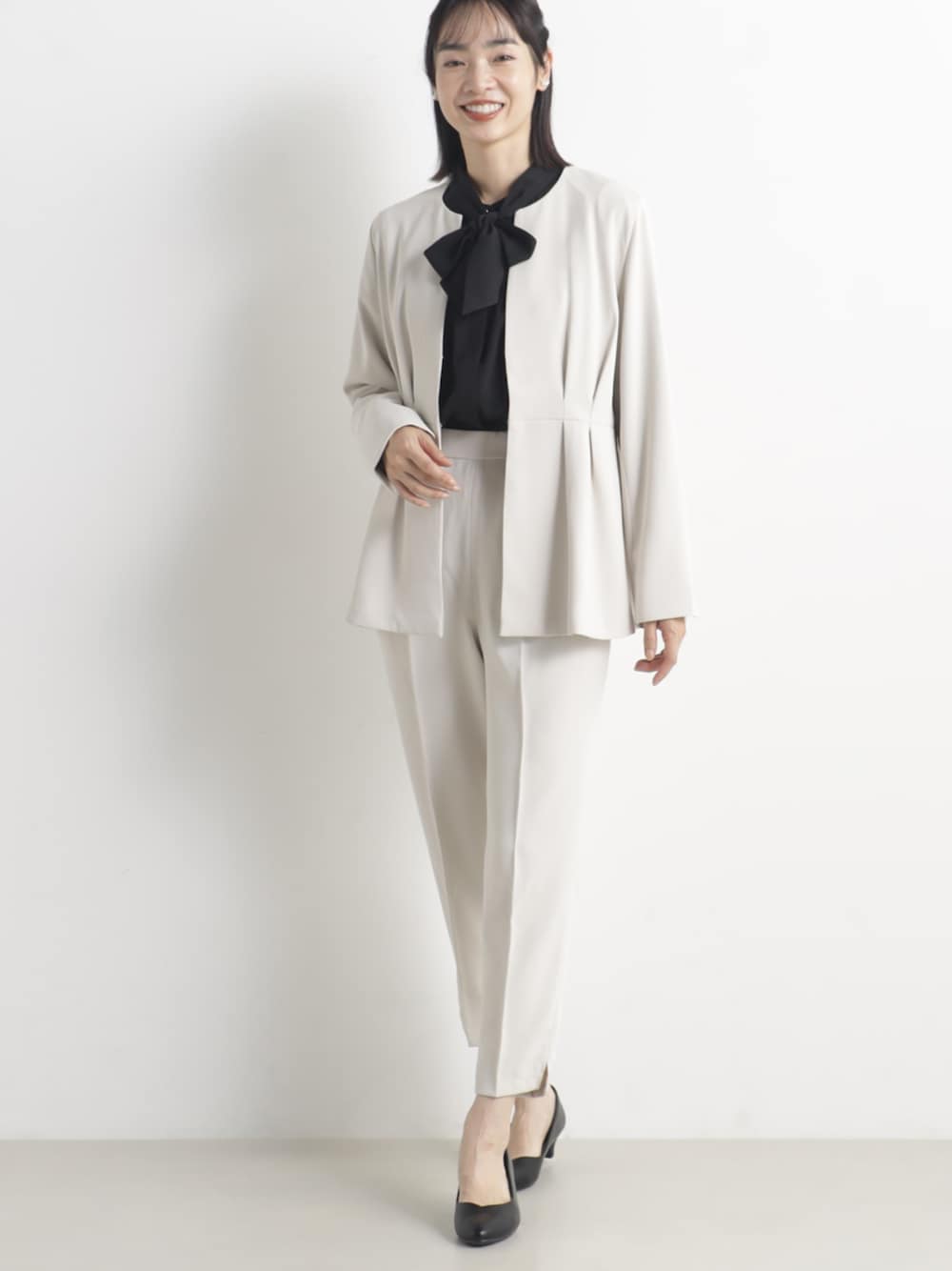 スラムデザインのジャケットは動きがあり女性らしい印象に。イージーケア、UVカット、接触冷感素材を使用。