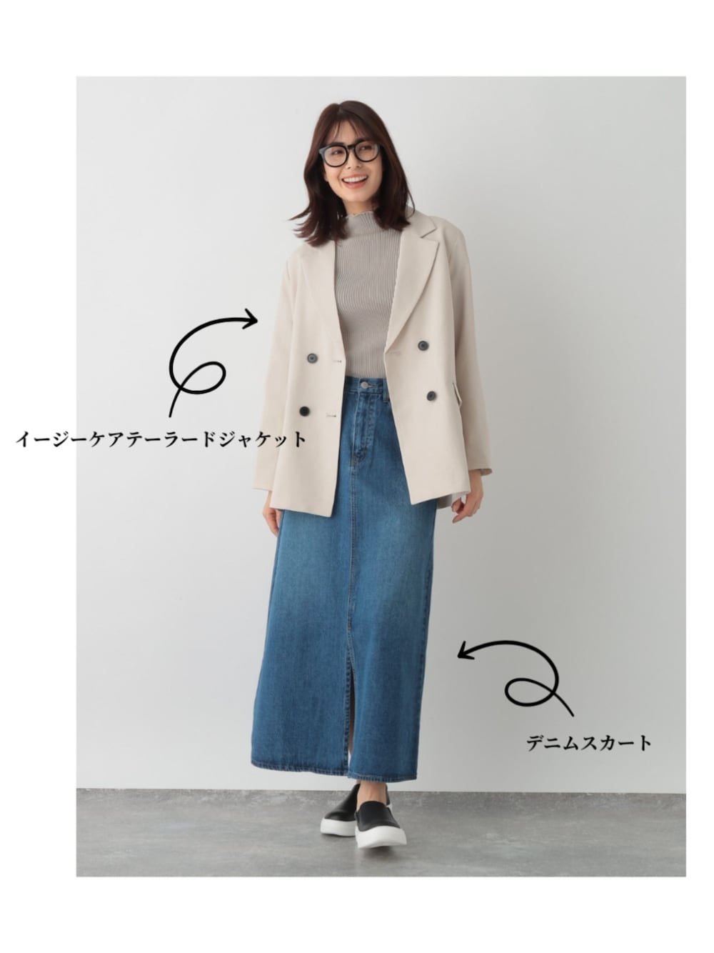 インコーデだけど、ジャケット着用することでお腹周りをカバーしてくて綺麗めにも使える便利なアイテムです⭐︎ イージーケアなので、ラクに着れます!