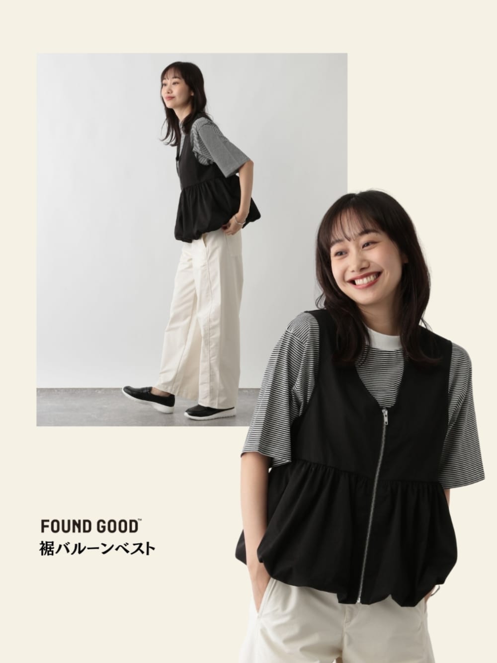 トレンドの裾バルーンシルエットが特徴のベスト。 ZIPで着脱し易く、羽織としても活躍する1枚。