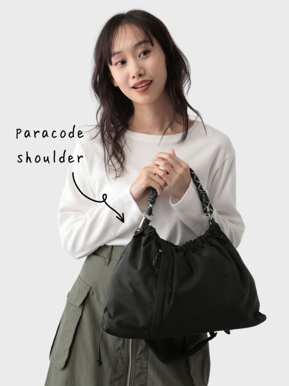 口元はゴム入りのギャザー仕様で、荷物の出し入れもスムーズ。肩当たりの良いショルダーベルトは、長さ調節可能で肩掛けと斜め掛けで持つことができる。