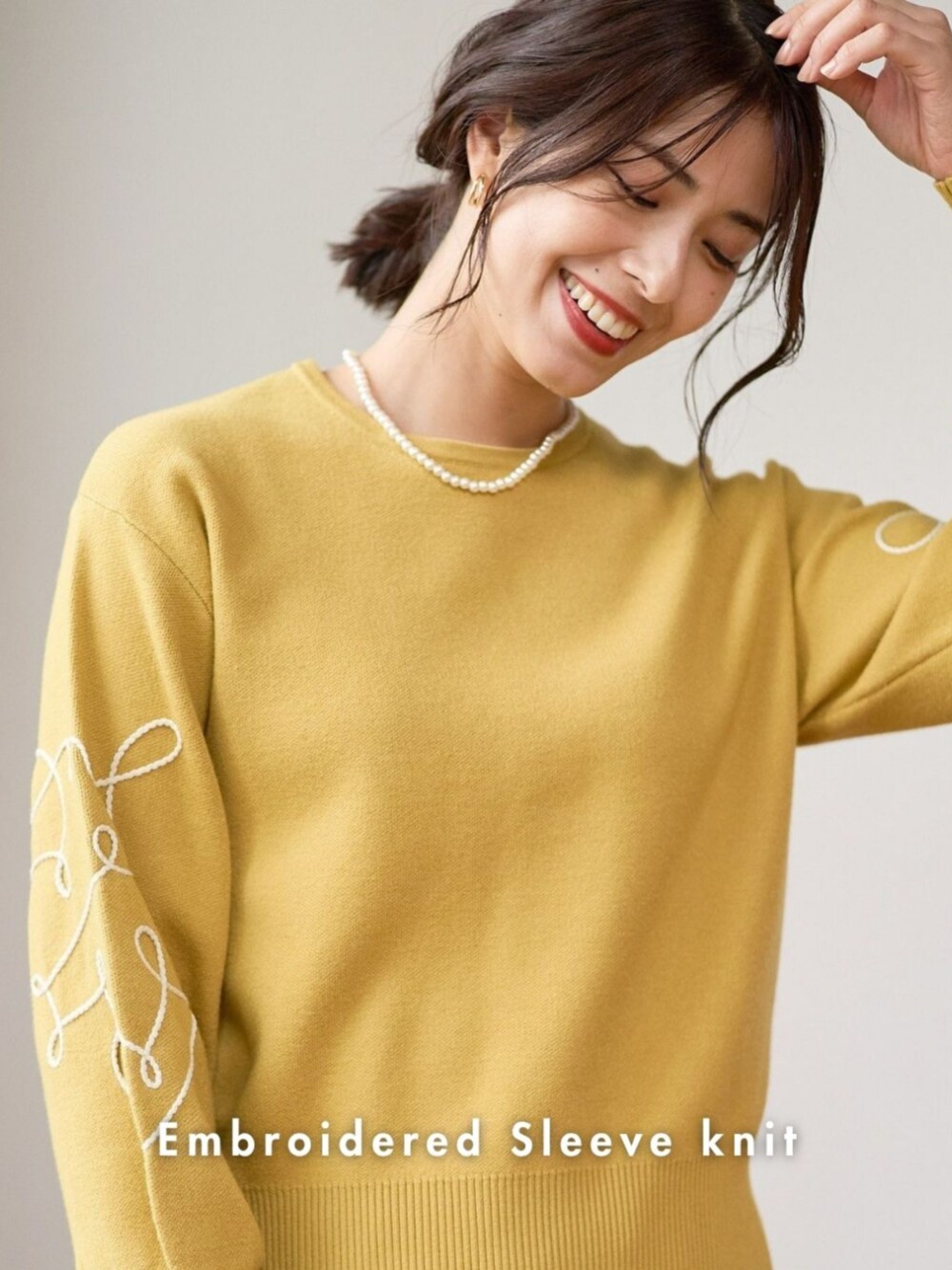 袖に入ったフラワーモチーフのコード刺繍がポイントのニットプルオーバー。