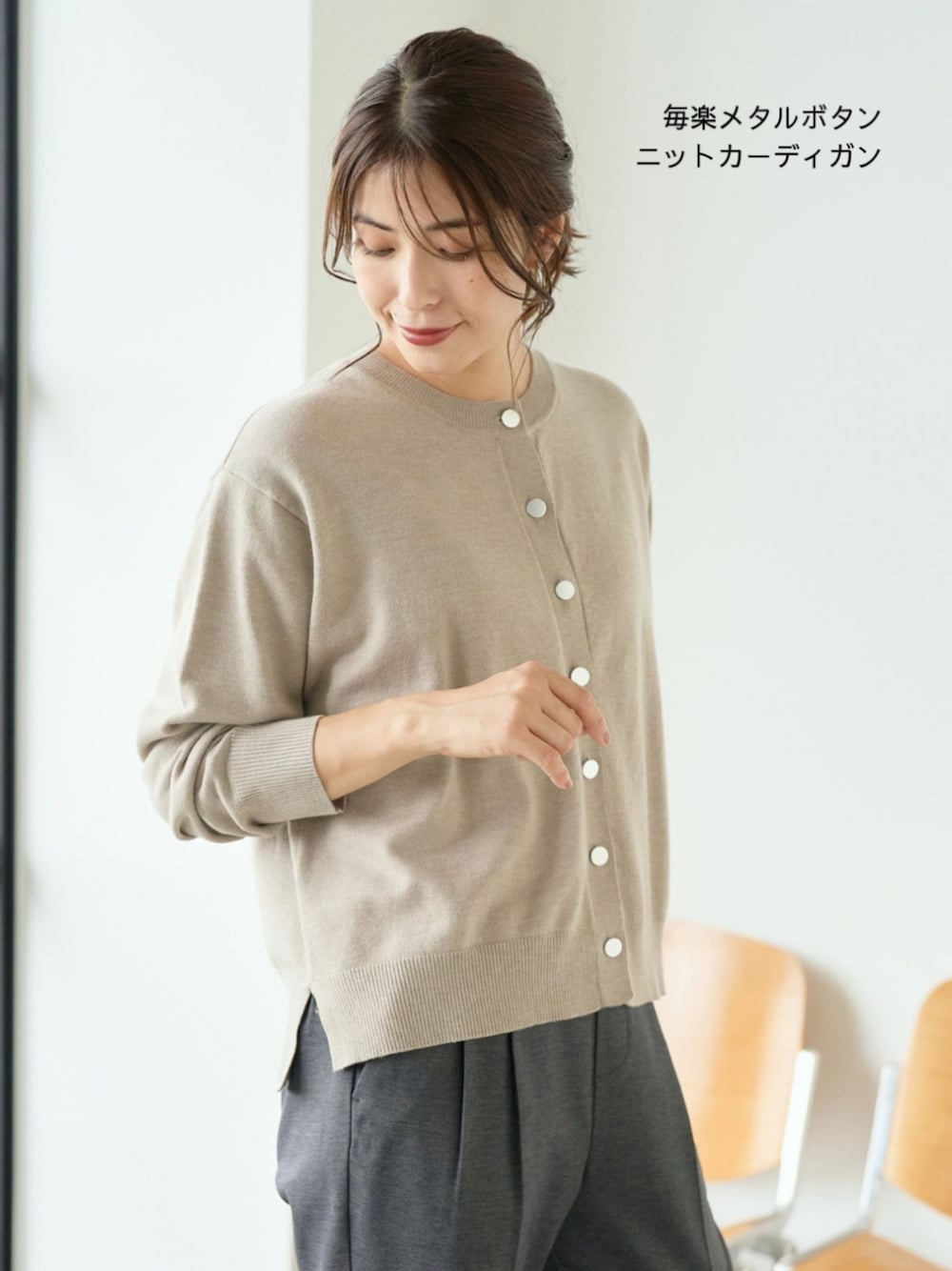 アンチピリング糸を使い、スムース編みにすることで、カットソー感覚&お手入れラクチンで毎日着たくなるニット。トレンドのメタルボタンがポイントのカーディガン。
