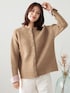表裏違う素材を使用した接結編みニットです。表はフワフワ、裏はニット特有のチクチク感のない糸でボリュウームのある防寒カーディガンに仕上げました。スカートにもパンツにも合わせやすいコーデに悩まない着回し力抜群の一枚です。ご自宅でのお手入れも簡単です。
