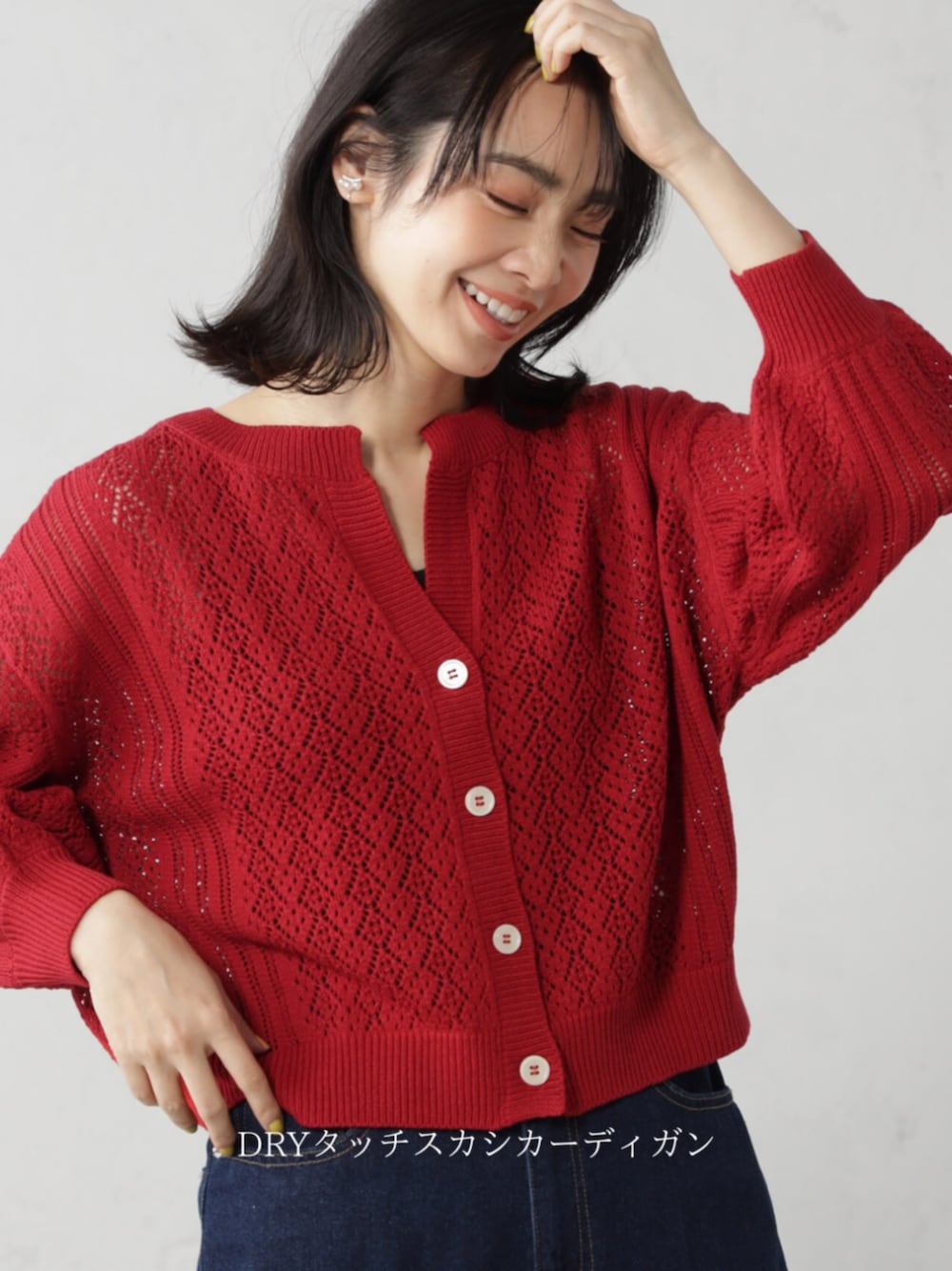 レース風の透かし編みがフェミニンなニットカーデ。ほどよい薄さで春から夏まで使える!
