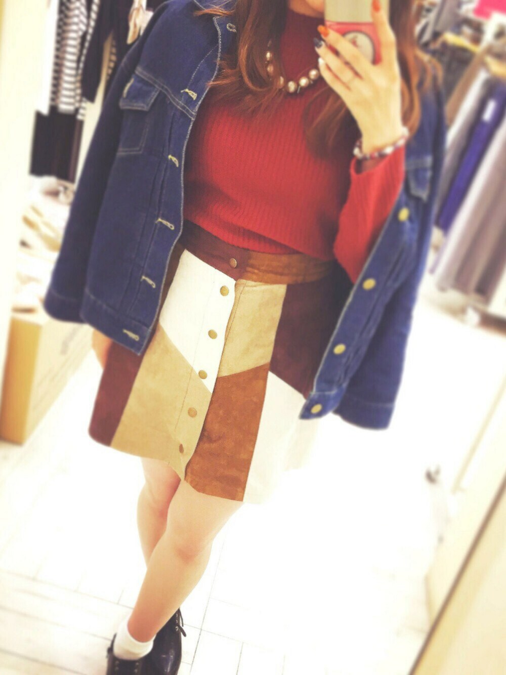 秋らしさをパッチワークのスカートでアピール😉 Gジャンを着てもいいし脱いでも おしゃれな感じで着こなしてみました🙈💗