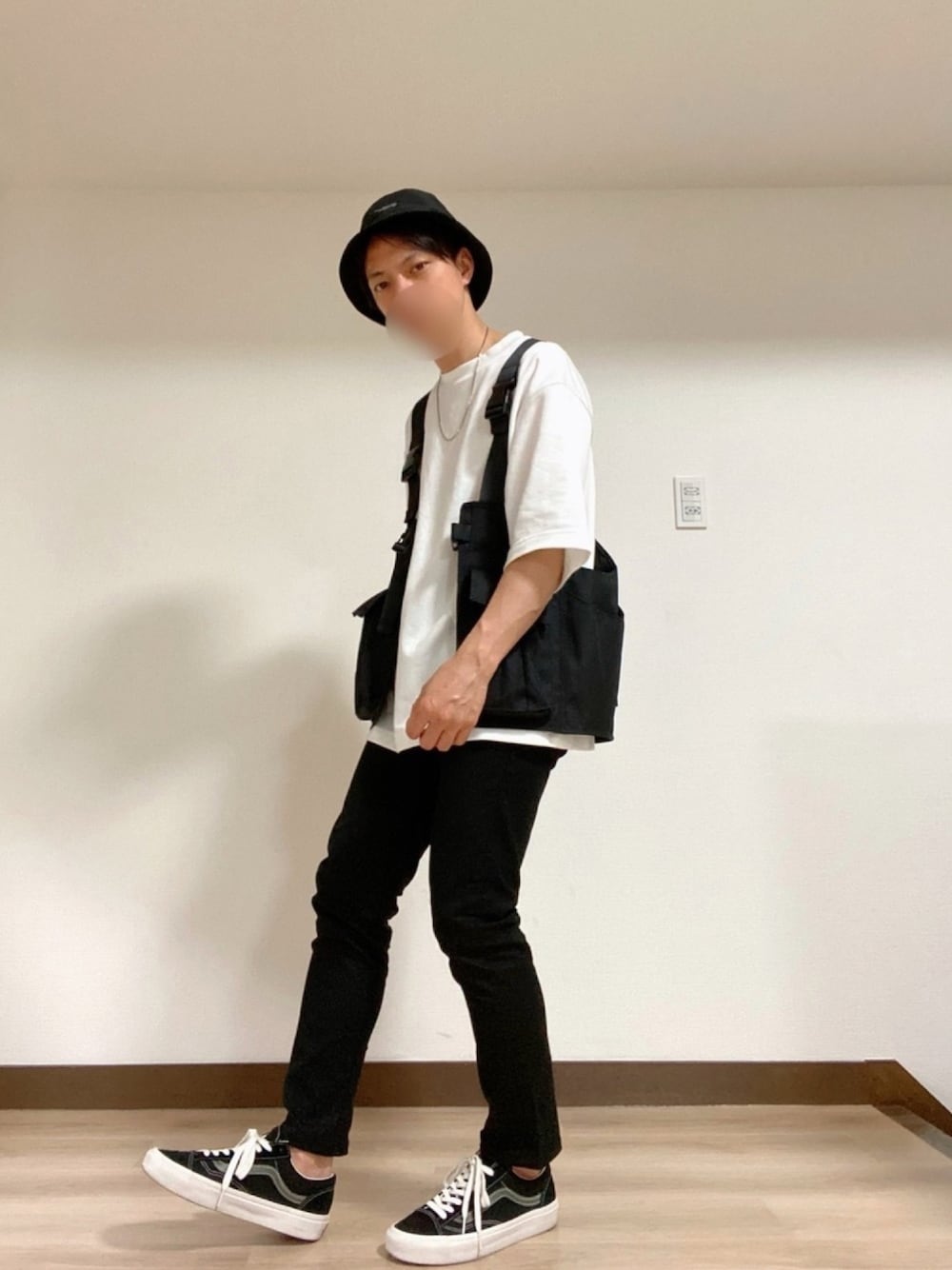 【モノトーンコーデ】 モノトーンコーデ👕 ベストとバケハを加えるだけで一味違ったコーデに変わります✨ 【WEARISTA じーたー×DEVICE コラボ】 のベスト。 かなり収納があるのでおすすめ! 長財布もバッチリ入ります👍